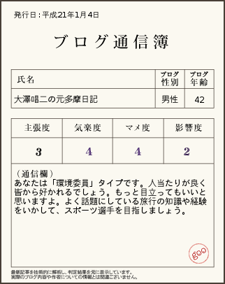 まず、こちらが昨年12月24日時点の評価。 性別、年齢ともまあそんな感じでしょう。 運動の知識や経験を生かすのはいいのですが、そこからなぜアナウンサー? と思わないでもないですが。 笑ってしまったのが、次のなんです。1月4日時点の評価。 ブログ年齢、「42歳」!! あのぉ、僕まだ28なんですけど……。 いや、この原因ははっきりしていて、大晦日に書いた、「ゆく川の流れは絶えずして」って記事ですね。 年寄り臭いことを、と言われれば返す言葉もありません。 それにしても、何もひとまわり以上年上の評価しなくなって……(汗)。 そしてなぜか「スポーツ選手を目指しましょう」。42歳からですか?(笑) 最新の記事何件かを参考に評価されるので、毎回書かれることが変わって楽しいです。 皆さんもよろしければ、是非。