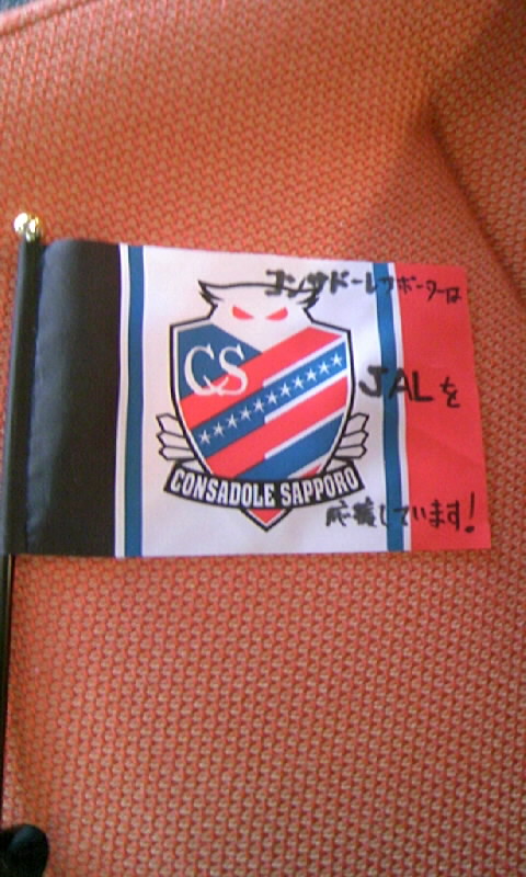 といっても、卓上フラッグに 「コンサドーレサポーターはJALを応援しています!」 と書いて、CAの方に渡しただけなんですけどね。 しかも、サインペンにじんでしまってる。意外に書くの難しかった〓 それでも、キックオフイベントではJAL様継続が発表されると拍手が起きたっていうことだから、JAL様への感謝の気持ちはコンササポみんな同じだと思います。その気持ちを代表して感謝を伝えられたかなと思ってます。 CAの方は、感謝感激!みたいな感じでとても喜んで下さって、お渡しして良かったと思いました。 社に持って帰って……っておっしゃってたので、JALの社内かJAL機内か、どこかに飾ってもらえてるのかな? 北海道はどこに試合に行くにも飛行機必須だから、コンサのスポンサーになるメリットは大きい、とか、スポンサー額何千万といっても、現金じゃなくて、選手やスタッフの移動時の座席を確保しているだけ(現物支給を金額換算)だとしたら、それほど重荷じゃないのかも、とか。いろいろ考えることはあります。 それでも、こんな企業本体の存亡に関わる時期に、スポーツに、コンサドーレに協力してくれる。こんなありがたいことはないです。 JAL様の経営再建の成功をお祈りし、また微力ですがJAL様を利用することでお力にもなりたいと思います! コンサドーレサポーターはJALを応援しています!